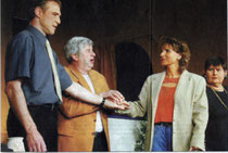 Mutter Irene (Doris Rusche) und Tochter Margret (Susanne Lohmann) dürfen nichts ahnen. Nur der Sekretär Dr. Hellwig (Ludger Harlinghausen) ist eingeweiht.